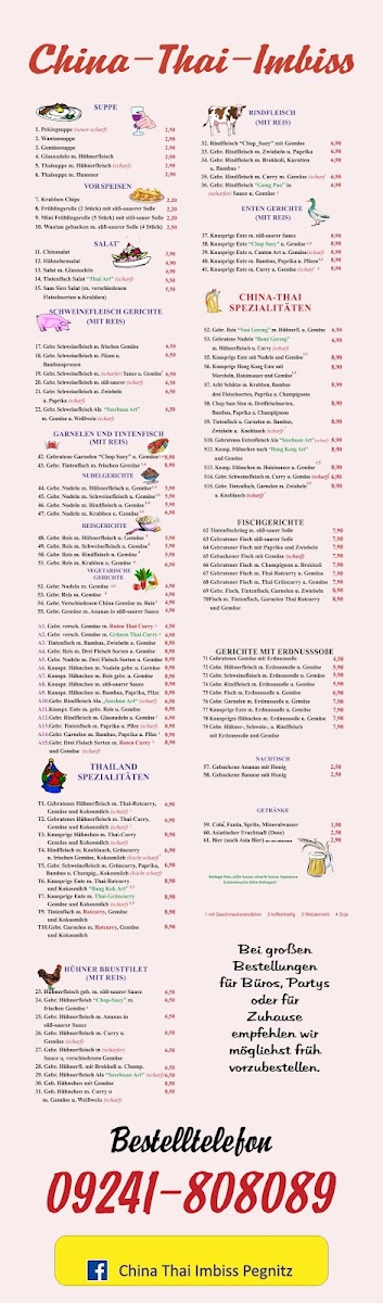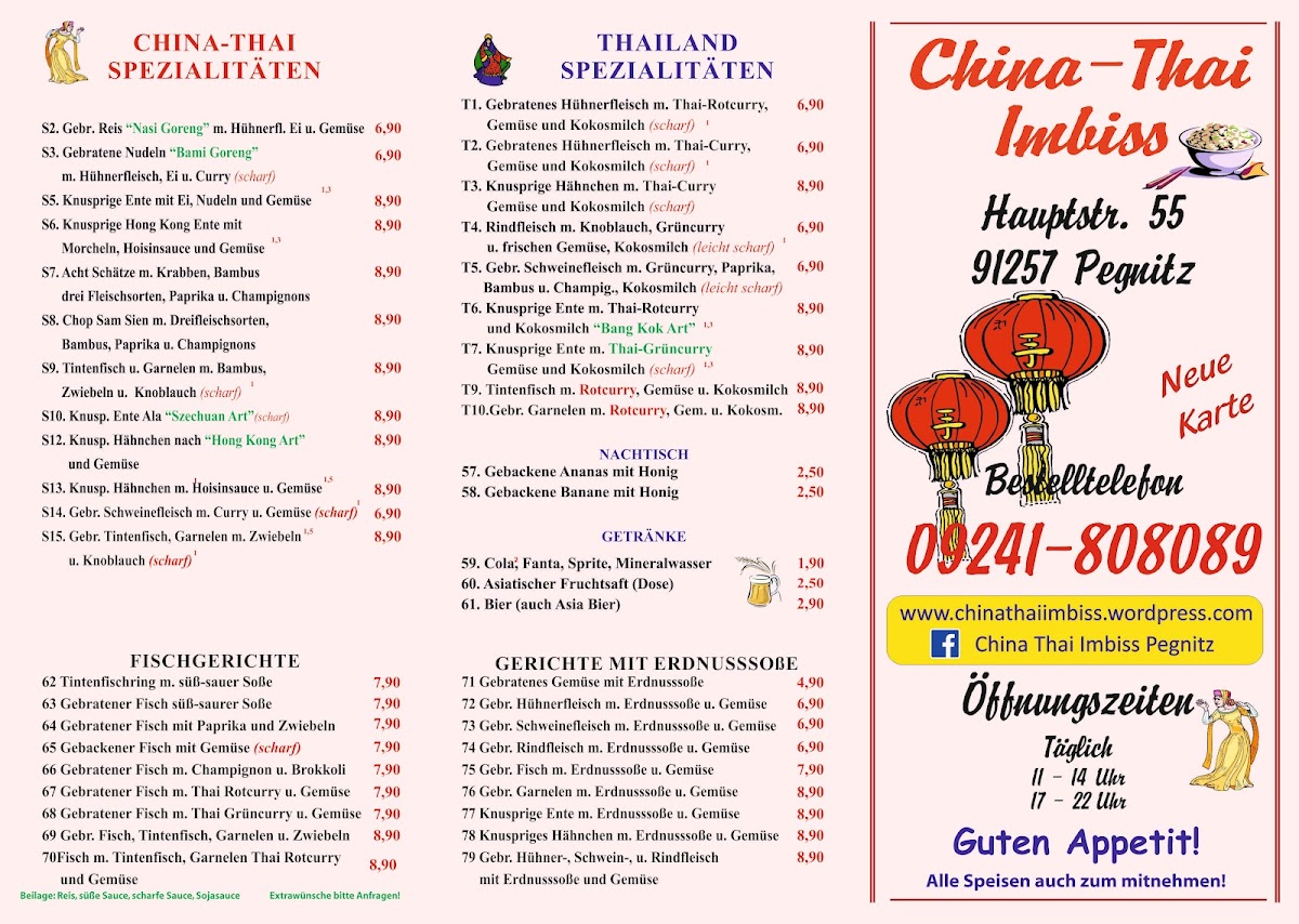 China-Thai Imbiss, located on Hauptstraße in Pegnitz, offers a vibrant fusion of Thai and Chinese fast food that excites the palate without stretching the wallet. Known for generous portions and quick service, it’s a favorite among locals craving authentic Asian flavors in a casual setting. Highlights include perfectly cooked duck, tender chicken noodles, and a seafood medley featuring fish, shrimp, and squid—each dish richly sauced but sometimes a bit heavy on the liquid. The menu emphasizes traditional aromatic spices and fresh ingredients, delivering bold taste in every bite. While the atmosphere is more grab-and-go than dine-in, the food’s quality and authenticity shine through. China-Thai Imbiss stands out as a reliable spot for affordable, flavorful meals that satisfy cravings for Thai and Chinese cuisine alike. Just remember to bring your own cutlery to fully enjoy your takeaway experience.
